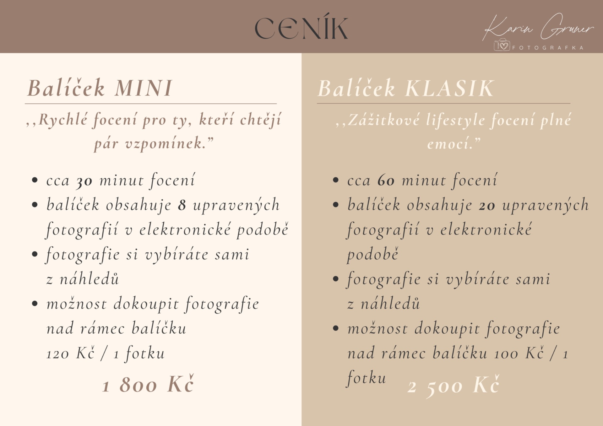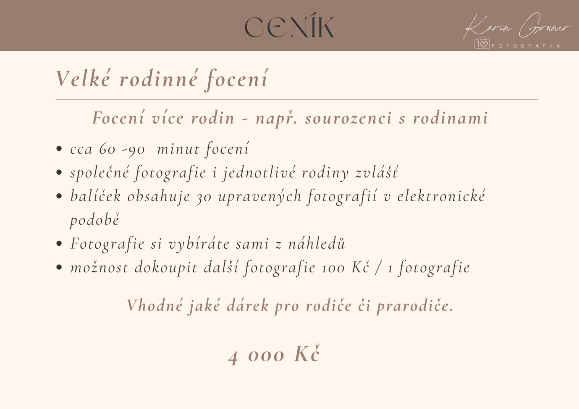 Záleží na rozsahu focení, místě i Vašich přáních - ráda s Vámi vše projdu a navrhnu ideální variantu.